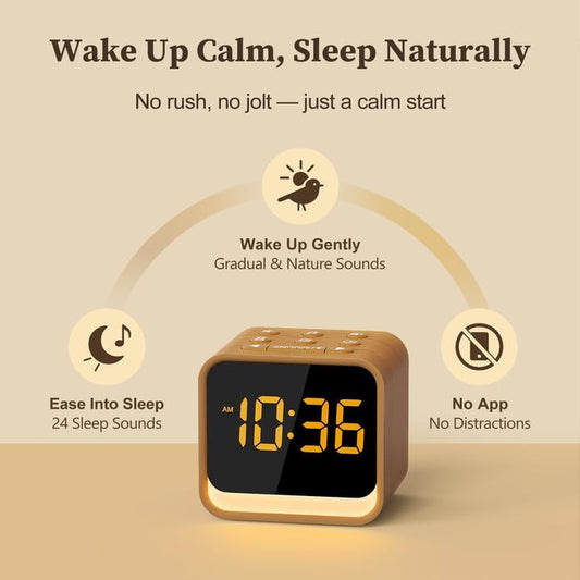 Wooden Sound Machine Alarm Clock for Bedrooms - Gentle Wake-Up with Birdsong, White Noise for Sleeping, Small Digital Clock for Phone-Free Routine
