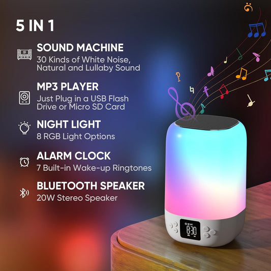 Alarm Clock Bluetooth Speaker, Night Light White Noise Machine Touch Bedside Lamp with Alarm Clock for Kids Multi-Color Changing Night Light